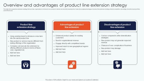 This slide showcases line extension strategy that can help organization to introduce new product in market and diversify business risk. It also showcases advantages of product line extension strategy that are competitive advantage, diversify brand portfolio, cost effective etc Here you can discover an assortment of the finest PowerPoint and Google Slides templates. With these templates, you can create presentations for a variety of purposes while simultaneously providing your audience with an eye catching visual experience. Download Overview Advantages Product Line Leveraging Horizontal Vertical Diversification Entering Professional Pdf to deliver an impeccable presentation. These templates will make your job of preparing presentations much quicker, yet still, maintain a high level of quality. Slidegeeks has experienced researchers who prepare these templates and write high quality content for you. Later on, you can personalize the content by editing the Overview Advantages Product Line Leveraging Horizontal Vertical Diversification Entering Professional Pdf. This slide showcases line extension strategy that can help organization to introduce new product in market and diversify business risk. It also showcases advantages of product line extension strategy that are competitive advantage, diversify brand portfolio, cost effective etc