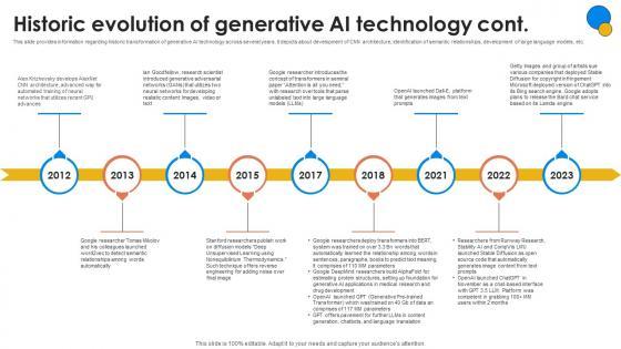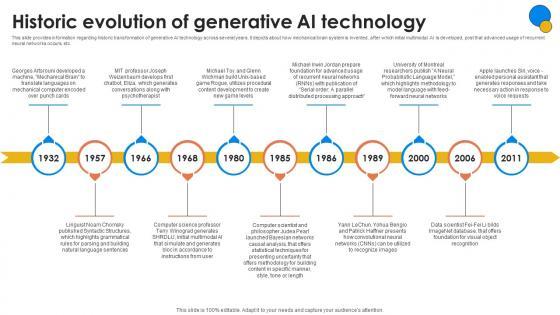 This slide provides information regarding historic transformation of generative AI technology across several years. It depicts about how mechanical brain system is invented, after which initial multimodal AI is developed, post that advanced usage of recurrent neural networks occurs, etc. Retrieve professionally designed Historic Evolution Of Generative AI Generative AI For Better Productivity AI SS V to effectively convey your message and captivate your listeners. Save time by selecting pre-made slideshows that are appropriate for various topics, from business to educational purposes. These themes come in many different styles, from creative to corporate, and all of them are easily adjustable and can be edited quickly. Access them as PowerPoint templates or as Google Slides themes. You do not have to go on a hunt for the perfect presentation because Slidegeeks got you covered from everywhere. This slide provides information regarding historic transformation of generative AI technology across several years. It depicts about how mechanical brain system is invented, after which initial multimodal AI is developed, post that advanced usage of recurrent neural networks occurs, etc.