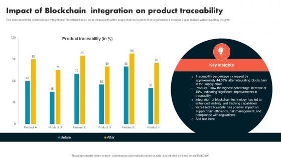 This slide depicts the positive impact integration of blockchain has on product traceability within supply chain ecosystem of an organization. It includes 2 year analysis with relevant key insights. Slidegeeks is one of the best resources for PowerPoint templates. You can download easily and regulate Impact Of Blockchain Integration On Product Supply Chain Evolution Harnessing The Power BCT SS V for your personal presentations from our wonderful collection. A few clicks is all it takes to discover and get the most relevant and appropriate templates. Use our Templates to add a unique zing and appeal to your presentation and meetings. All the slides are easy to edit and you can use them even for advertisement purposes. This slide depicts the positive impact integration of blockchain has on product traceability within supply chain ecosystem of an organization. It includes 2 year analysis with relevant key insights.