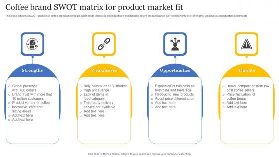 This slide exhibits a SWOT analysis of coffee brand which helps business to improvise and adapt as a good market before product launch. Key components are strengths, weakness, opportunities and threats Showcasing this set of slides titled Coffee Brand Swot Matrix For Product Market Fit Icons Pdf The topics addressed in these templates are Strengths, Weaknesses, Opportunities, Threats All the content presented in this PPT design is completely editable. Download it and make adjustments in color, background, font etc. as per your unique business setting. This slide exhibits a SWOT analysis of coffee brand which helps business to improvise and adapt as a good market before product launch. Key components are strengths, weakness, opportunities and threats
