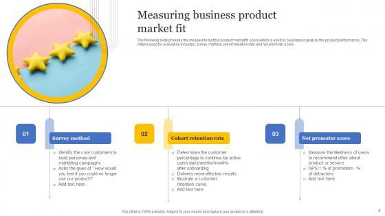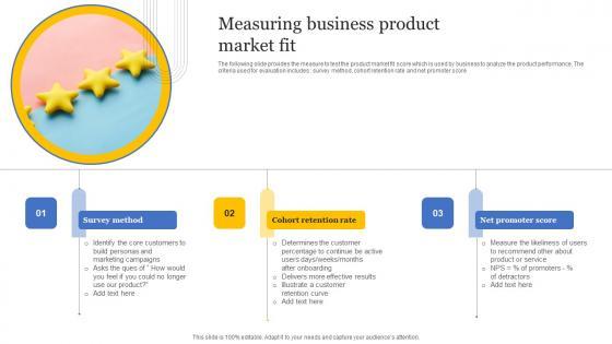 The following slide provides the measure to test the product market fit score which is used by business to analyze the product performance. The criteria used for evaluation includes survey method, cohort retention rate and net promoter score Pitch your topic with ease and precision using this Measuring Business Product Market Fit Guidelines Pdf This layout presents information on Survey Method, Cohort Retention Rate, Net Promoter Score It is also available for immediate download and adjustment. So, changes can be made in the color, design, graphics or any other component to create a unique layout. The following slide provides the measure to test the product market fit score which is used by business to analyze the product performance. The criteria used for evaluation includes survey method, cohort retention rate and net promoter score
