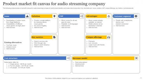The following slide provides a market fir canvas for audio streaming company to build a brand identity and create stand out product. Key elements are issue, solution, USP, unique offerings, key metrics, cost structure etc. Showcasing this set of slides titled Product Market Fit Canvas For Audio Streaming Company Formats Pdf The topics addressed in these templates are Advantages, Customer Segment, Key Metrics All the content presented in this PPT design is completely editable. Download it and make adjustments in color, background, font etc. as per your unique business setting. The following slide provides a market fir canvas for audio streaming company to build a brand identity and create stand out product. Key elements are issue, solution, USP, unique offerings, key metrics, cost structure etc.