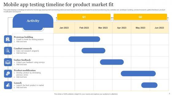 This slide displays a strategic timeline for mobile app development and testing before product launch used by businesses for product positioning. Key activities are prototype building, conduct research, gather feedback, product modification and launch. Pitch your topic with ease and precision using this Mobile App Testing Timeline For Product Market Fit Brochure Pdf This layout presents information on Prototype Building, Conduct Research, Gather Feedback It is also available for immediate download and adjustment. So, changes can be made in the color, design, graphics or any other component to create a unique layout. This slide displays a strategic timeline for mobile app development and testing before product launch used by businesses for product positioning. Key activities are prototype building, conduct research, gather feedback, product modification and launch.