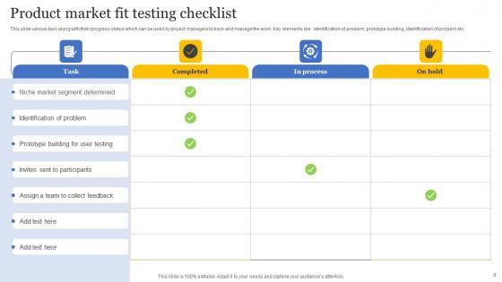 This slide various task along with their progress status which can be used by project managers to track and manage the work. Key elements are identification of problem, prototype building, identification of problem etc. Pitch your topic with ease and precision using this Product Market Fit Testing Checklist Topics Pdf This layout presents information on Niche Market Segment Determined, In Process It is also available for immediate download and adjustment. So, changes can be made in the color, design, graphics or any other component to create a unique layout. This slide various task along with their progress status which can be used by project managers to track and manage the work. Key elements are identification of problem, prototype building, identification of problem etc.
