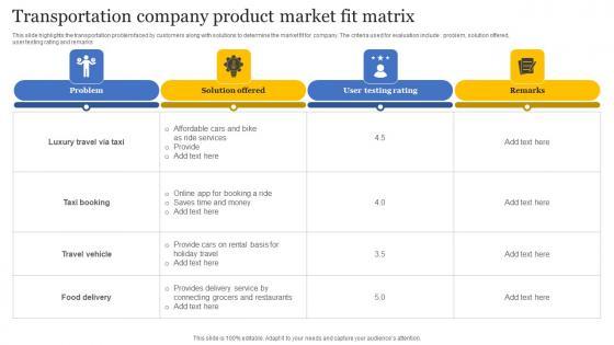 This slide highlights the transportation problem faced by customers along with solutions to determine the market fit for company. The criteria used for evaluation include problem, solution offered, user testing rating and remarks Pitch your topic with ease and precision using this Transportation Company Product Market Fit Matrix Sample Pdf This layout presents information on Solution Offered, User Testing Rating, Taxi Booking It is also available for immediate download and adjustment. So, changes can be made in the color, design, graphics or any other component to create a unique layout. This slide highlights the transportation problem faced by customers along with solutions to determine the market fit for company. The criteria used for evaluation include problem, solution offered, user testing rating and remarks