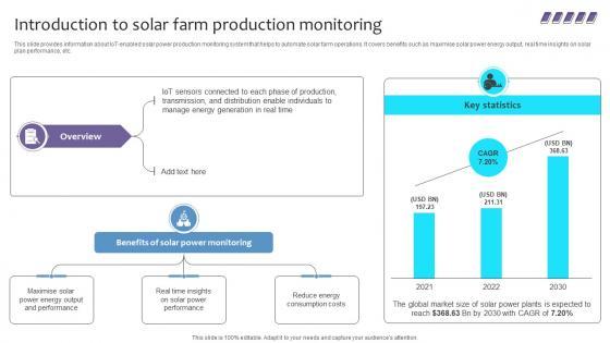This slide provides information about IoT-enabled solar power production monitoring system that helps to automate solar farm operations. It covers benefits such as maximise solar power energy output, real time insights on solar plan performance, etc. Retrieve professionally designed Empowering The Future Introduction To Solar Farm Production Monitoring IoT SS V to effectively convey your message and captivate your listeners. Save time by selecting pre-made slideshows that are appropriate for various topics, from business to educational purposes. These themes come in many different styles, from creative to corporate, and all of them are easily adjustable and can be edited quickly. Access them as PowerPoint templates or as Google Slides themes. You do not have to go on a hunt for the perfect presentation because Slidegeeks got you covered from everywhere. This slide provides information about IoT-enabled solar power production monitoring system that helps to automate solar farm operations. It covers benefits such as maximise solar power energy output, real time insights on solar plan performance, etc.