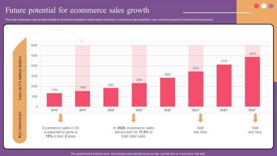 This slide showcases sales growth potential of ecommerce websites in united states of America. It showcases data of past five years and forecast period of next three financial years. Crafting an eye catching presentation has never been more straightforward. Let your presentation shine with this tasteful yet straightforward Future Potential For Ecommerce Sales Website Optimization To Improve Product Sale Clipart Pdf template. It offers a minimalistic and classy look that is great for making a statement. The colors have been employed intelligently to add a bit of playfulness while still remaining professional. Construct the ideal Future Potential For Ecommerce Sales Website Optimization To Improve Product Sale Clipart Pdf that effortlessly grabs the attention of your audience Begin now and be certain to wow your customers This slide showcases sales growth potential of ecommerce websites in united states of America. It showcases data of past five years and forecast period of next three financial years.