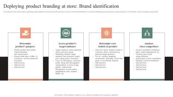 This slide provides information regarding implementation of product branding at store in terms of brand identification. It includes identifying product purpose, target audience, core beliefs, close competitor assessment. Crafting an eye-catching presentation has never been more straightforward. Let your presentation shine with this tasteful yet straightforward Deploying Product Branding At Store Brand Identification Leveraging Corporate Themes Pdf template. It offers a minimalistic and classy look that is great for making a statement. The colors have been employed intelligently to add a bit of playfulness while still remaining professional. Construct the ideal Deploying Product Branding At Store Brand Identification Leveraging Corporate Themes Pdf that effortlessly grabs the attention of your audience. Begin now and be certain to wow your customers. This slide provides information regarding implementation of product branding at store in terms of brand identification. It includes identifying product purpose, target audience, core beliefs, close competitor assessment.
