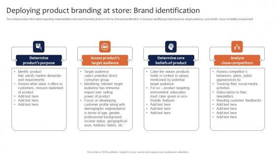 This slide provides information regarding implementation of product branding at store in terms of brand identification. It includes identifying product purpose, target audience, core beliefs, close competitor assessment. From laying roadmaps to briefing everything in detail, our templates are perfect for you. You can set the stage with your presentation slides. All you have to do is download these easy to edit and customizable templates. Efficient Administration Of P will help you deliver an outstanding performance that everyone would remember and praise you for. Do download this presentation today.