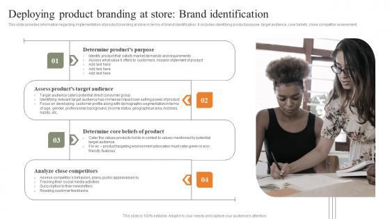 This slide provides information regarding implementation of product branding at store in terms of brand identification. It includes identifying product purpose, target audience, core beliefs, close competitor assessment. Presenting this PowerPoint presentation, titled Product Branding To Enhance Deploying Product Branding At Store Brand Identification Microsoft PDF, with topics curated by our researchers after extensive research. This editable presentation is available for immediate download and provides attractive features when used. Download now and captivate your audience. Presenting this Product Branding To Enhance Deploying Product Branding At Store Brand Identification Microsoft PDF. Our researchers have carefully researched and created these slides with all aspects taken into consideration. This is a completely customizable Product Branding To Enhance Deploying Product Branding At Store Brand Identification Microsoft PDF that is available for immediate downloading. Download now and make an impact on your audience. Highlight the attractive features available with our PPTs.