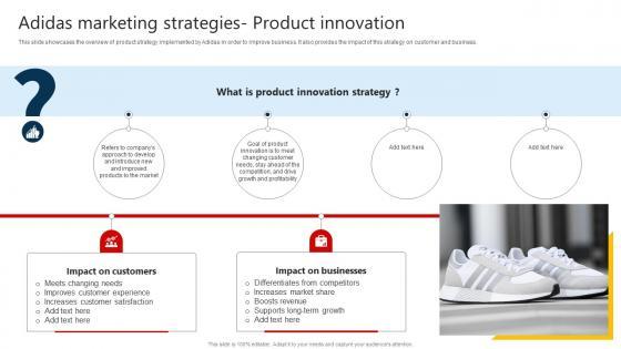 This slide showcases the overview of product strategy implemented by Adidas in order to improve business. It also provides the impact of this strategy on customer and business. Present like a pro with Adidas Marketing Strategies Product Innovation Strategy SS V. Create beautiful presentations together with your team, using our easy-to-use presentation slides. Share your ideas in real-time and make changes on the fly by downloading our templates. So whether you are in the office, on the go, or in a remote location, you can stay in sync with your team and present your ideas with confidence. With Slidegeeks presentation got a whole lot easier. Grab these presentations today. This slide showcases the overview of product strategy implemented by Adidas in order to improve business. It also provides the impact of this strategy on customer and business.