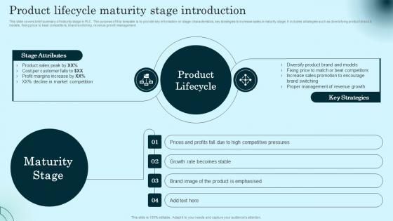 This slide covers brief summary of maturity stage in PLC. The purpose of this template is to provide key information on stage characteristics, key strategies to increase sales in maturity stage. It includes strategies such as diversifying product brand and models, fixing price to beat competitors, brand switching, revenue growth management. Explore a selection of the finest Product Lifecycle Maturity Stage Introduction Diagrams PDF here. With a plethora of professionally designed and pre made slide templates, you can quickly and easily find the right one for your upcoming presentation. You can use our Product Lifecycle Maturity Stage Introduction Diagrams PDF to effectively convey your message to a wider audience. Slidegeeks has done a lot of research before preparing these presentation templates. The content can be personalized and the slides are highly editable. Grab templates today from Slidegeeks.