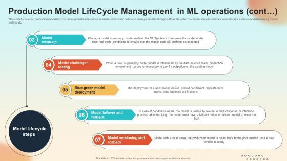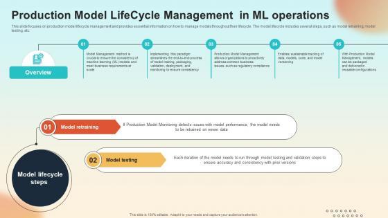 This slide focuses on production model lifecycle management and provides essential information on how to manage models throughout their lifecycle. The model lifecycle includes several steps, such as model retraining, model testing, etc. Do you have an important presentation coming up Are you looking for something that will make your presentation stand out from the rest Look no further than Production Model Lifecycle Management In ML Operations Introduction To MLOPs IT. With our professional designs, you can trust that your presentation will pop and make delivering it a smooth process. And with Slidegeeks, you can trust that your presentation will be unique and memorable. So why wait Grab Production Model Lifecycle Management In ML Operations Introduction To MLOPs IT today and make your presentation stand out from the rest This slide focuses on production model lifecycle management and provides essential information on how to manage models throughout their lifecycle. The model lifecycle includes several steps, such as model retraining, model testing, etc.