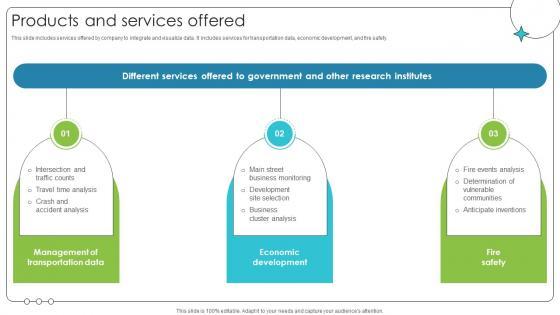 This slide includes services offered by company to integrate and visualize data. It includes services for transportation data, economic development, and fire safety. Coming up with a presentation necessitates that the majority of the effort goes into the content and the message you intend to convey. The visuals of a PowerPoint presentation can only be effective if it supplements and supports the story that is being told. Keeping this in mind our experts created Products And Services Offered Investor Oriented Urbanlogiq Fundraising Deck to reduce the time that goes into designing the presentation. This way, you can concentrate on the message while our designers take care of providing you with the right template for the situation. This slide includes services offered by company to integrate and visualize data. It includes services for transportation data, economic development, and fire safety.
