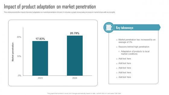 This slide presents the impact of product adaptation on market penetration of brand. It includes a graph showcasing increase in market share with key insights. Are you searching for a Effective Product Adaptation Impact Of Product Adaptation On Market Penetration Template PDF that is uncluttered, straightforward, and original Its easy to edit, and you can change the colors to suit your personal or business branding. For a presentation that expresses how much effort you have put in, this template is ideal With all of its features, including tables, diagrams, statistics, and lists, its perfect for a business plan presentation. Make your ideas more appealing with these professional slides. Download Effective Product Adaptation Impact Of Product Adaptation On Market Penetration Template PDF from Slidegeeks today. This slide presents the impact of product adaptation on market penetration of brand. It includes a graph showcasing increase in market share with key insights.