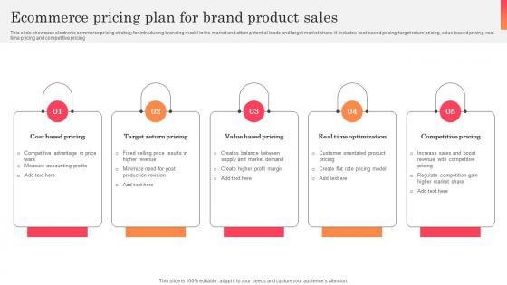 This slide showcase electronic commerce pricing strategy for introducing branding model in the market and attain potential leads and target market share. It includes cost based pricing, target return pricing, value based pricing, real time pricing and competitive pricing. Showcasing this set of slides titled Ecommerce Pricing Plan For Brand Product Sales Pictures Pdf. The topics addressed in these templates are Cost Based Pricing, Target Return Pricing, Value Based Pricing. All the content presented in this PPT design is completely editable. Download it and make adjustments in color, background, font etc. as per your unique business setting. This slide showcase electronic commerce pricing strategy for introducing branding model in the market and attain potential leads and target market share. It includes cost based pricing, target return pricing, value based pricing, real time pricing and competitive pricing.
