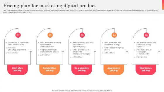 This slide showcase pricing strategies for marketing digital product to generate greater interest in driving sales to attract new target audience towards business. It includes cost plus pricing, competitive pricing, co operative pricing, aggressive pricing and dismissive pricing. Showcasing this set of slides titled Pricing Plan For Marketing Digital Product Themes Pdf. The topics addressed in these templates are Competitive Pricing, Co Operative Pricing, Aggressive Pricing, Dismissive Pricing. All the content presented in this PPT design is completely editable. Download it and make adjustments in color, background, font etc. as per your unique business setting. This slide showcase pricing strategies for marketing digital product to generate greater interest in driving sales to attract new target audience towards business. It includes cost plus pricing, competitive pricing, co operative pricing, aggressive pricing and dismissive pricing.