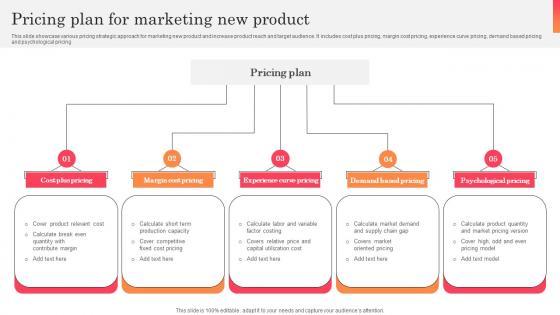 This slide showcase various pricing strategic approach for marketing new product and increase product reach and target audience. It includes cost plus pricing, margin cost pricing, experience curve pricing, demand based pricing and psychological pricing. Pitch your topic with ease and precision using this Pricing Plan For Marketing New Product Infographics Pdf. This layout presents information on Margin Cost Pricing, Experience Curve Pricing, Demand Based Pricing. It is also available for immediate download and adjustment. So, changes can be made in the color, design, graphics or any other component to create a unique layout. This slide showcase various pricing strategic approach for marketing new product and increase product reach and target audience. It includes cost plus pricing, margin cost pricing, experience curve pricing, demand based pricing and psychological pricing.