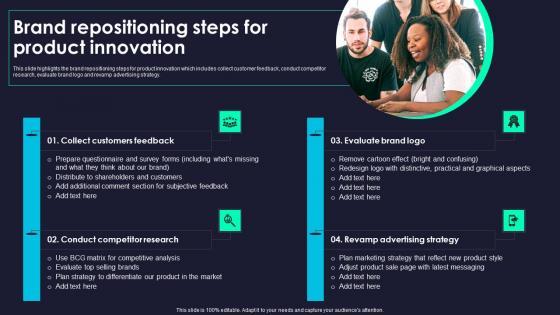 This slide highlights the brand repositioning steps for product innovation which includes collect customer feedback, conduct competitor research, evaluate brand logo and revamp advertising strategy. Create an editable Brand Repositioning Steps Product Rebranding Marketing Strategies For Effective Mockup Pdf that communicates your idea and engages your audience. Whether you are presenting a business or an educational presentation, pre designed presentation templates help save time. Brand Repositioning Steps Product Rebranding Marketing Strategies For Effective Mockup Pdf is highly customizable and very easy to edit, covering many different styles from creative to business presentations. Slidegeeks has creative team members who have crafted amazing templates. So, go and get them without any delay. This slide highlights the brand repositioning steps for product innovation which includes collect customer feedback, conduct competitor research, evaluate brand logo and revamp advertising strategy.
