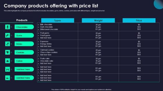 This slide highlights the company products line which includes chocolates, gums, drinks, cookies, and cakes with different types, weight and price list. Do you have to make sure that everyone on your team knows about any specific topic I yes, then you should give Company Products Offering Rebranding Marketing Strategies For Effective Sample Pdf a try. Our experts have put a lot of knowledge and effort into creating this impeccable Company Products Offering Rebranding Marketing Strategies For Effective Sample Pdf. You can use this template for your upcoming presentations, as the slides are perfect to represent even the tiniest detail. You can download these templates from the Slidegeeks website and these are easy to edit. So grab these today This slide highlights the company products line which includes chocolates, gums, drinks, cookies, and cakes with different types, weight and price list.