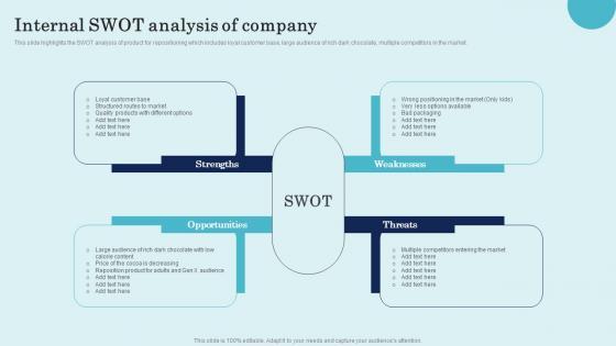 This slide highlights the SWOT analysis of product for repositioning which includes loyal customer base, large audience of rich dark chocolate, multiple competitors in the market. Whether you have daily or monthly meetings, a brilliant presentation is necessary. Internal SWOT Analysis Of Company Product Repositioning Technique Background Pdf can be your best option for delivering a presentation. Represent everything in detail using Internal SWOT Analysis Of Company Product Repositioning Technique Background Pdf and make yourself stand out in meetings. The template is versatile and follows a structure that will cater to your requirements. All the templates prepared by Slidegeeks are easy to download and edit. Our research experts have taken care of the corporate themes as well. So, give it a try and see the results. This slide highlights the SWOT analysis of product for repositioning which includes loyal customer base, large audience of rich dark chocolate, multiple competitors in the market.