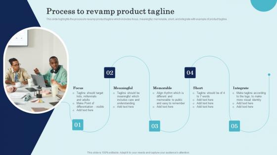 This slide highlights the process to revamp product tagline which includes focus, meaningful, memorable, short, and integrate with example of product tagline. Coming up with a presentation necessitates that the majority of the effort goes into the content and the message you intend to convey. The visuals of a PowerPoint presentation can only be effective if it supplements and supports the story that is being told. Keeping this in mind our experts created Process To Revamp Product Tagline Product Repositioning Technique Summary Pdf to reduce the time that goes into designing the presentation. This way, you can concentrate on the message while our designers take care of providing you with the right template for the situation. This slide highlights the process to revamp product tagline which includes focus, meaningful, memorable, short, and integrate with example of product tagline.