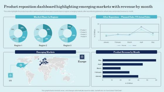This slide highlights the product reposition dashboard which showcases market share in regions, emerging markets, after repositioning planned vs actual sales and product revenue by month. Welcome to our selection of the Product Reposition Dashboard Highlighting Emerging Product Repositioning Technique Pictures Pdf. These are designed to help you showcase your creativity and bring your sphere to life. Planning and Innovation are essential for any business that is just starting out. This collection contains the designs that you need for your everyday presentations. All of our PowerPoints are 100 percent editable, so you can customize them to suit your needs. This multi-purpose template can be used in various situations. Grab these presentation templates today. This slide highlights the product reposition dashboard which showcases market share in regions, emerging markets, after repositioning planned vs actual sales and product revenue by month.