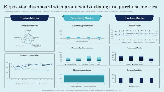 This slide highlights product reposition dashboard which showcases product attributes, advertising awareness, market share, product commitment, repeat purchase and message association. Slidegeeks has constructed Reposition Dashboard With Product Advertising Product Repositioning Technique Mockup Pdf after conducting extensive research and examination. These presentation templates are constantly being generated and modified based on user preferences and critiques from editors. Here, you will find the most attractive templates for a range of purposes while taking into account ratings and remarks from users regarding the content. This is an excellent jumping-off point to explore our content and will give new users an insight into our top-notch PowerPoint Templates. This slide highlights product reposition dashboard which showcases product attributes, advertising awareness, market share, product commitment, repeat purchase and message association.
