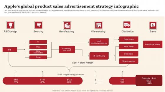 This slide shows an infographic for Apples distribution strategy. This template aims to highlight the channels used by apple to manufacture and market its products to make them accessible to the global market. It includes R and D, sourcing, manufacturing, warehousing, distribution, sales, etc. Pitch your topic with ease and precision using this Apples Global Product Sales Advertisement Strategy Infographic Template Pdf This layout presents information on Manufacturing, Warehousing, Distribution, Sales It is also available for immediate download and adjustment. So, changes can be made in the color, design, graphics or any other component to create a unique layout. This slide shows an infographic for Apples distribution strategy. This template aims to highlight the channels used by apple to manufacture and market its products to make them accessible to the global market. It includes R and D, sourcing, manufacturing, warehousing, distribution, sales, etc.