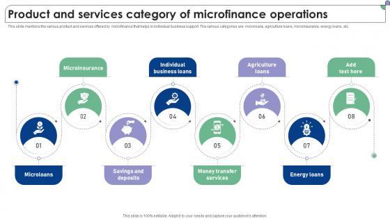 This slide mentions the various product and services offered by microfinance that helps in individual business support. The various categories are microloans, agriculture loans, microinsurance, energy loans, etc. Welcome to our selection of the Product And Services Category Of Microfinance Operations Complete Guide To Microfinance Fin SS V. These are designed to help you showcase your creativity and bring your sphere to life. Planning and Innovation are essential for any business that is just starting out. This collection contains the designs that you need for your everyday presentations. All of our PowerPoints are 100Percent editable, so you can customize them to suit your needs. This multi-purpose template can be used in various situations. Grab these presentation templates today. This slide mentions the various product and services offered by microfinance that helps in individual business support. The various categories are microloans, agriculture loans, microinsurance, energy loans, etc.
