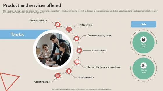 This slide presents the products and services offered by task management platform. It includes features in task and lists section such as create subtasks, set recollections and deadlines, create repeating tasks, prioritize tasks, attach files, create notes, appoint tasks, share lists, and group lists.Coming up with a presentation necessitates that the majority of the effort goes into the content and the message you intend to convey. The visuals of a PowerPoint presentation can only be effective if it supplements and supports the story that is being told. Keeping this in mind our experts created Product And Services Offered Work Management Tool Pitch Deck to reduce the time that goes into designing the presentation. This way, you can concentrate on the message while our designers take care of providing you with the right template for the situation. This slide presents the products and services offered by task management platform. It includes features in task and lists section such as create subtasks, set recollections and deadlines, create repeating tasks, prioritize tasks, attach files, create notes, appoint tasks, share lists, and group lists.