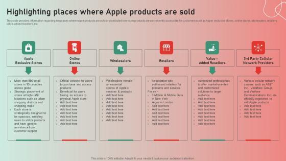 This slide provides information regarding key places where Apple products are sold or distributed to ensure products are conveniently accessible for customers such as Apple exclusive stores, online stores, wholesalers, retailers, value added resellers, etc. Want to ace your presentation in front of a live audience Our Apple Brand Story Journey Iconic Enterprise Highlighting Places Where Apple Products Portrait Pdf can help you do that by engaging all the users towards you. Slidegeeks experts have put their efforts and expertise into creating these impeccable powerpoint presentations so that you can communicate your ideas clearly. Moreover, all the templates are customizable, and easy to edit and downloadable. Use these for both personal and commercial use. This slide provides information regarding key places where Apple products are sold or distributed to ensure products are conveniently accessible for customers such as Apple exclusive stores, online stores, wholesalers, retailers, value added resellers, etc.