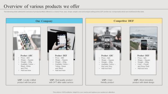 The following slide outlines the overview of product portfolio offered by a brand. Price, size, shape, weight, color and unique selling point USP are the key components which are mentioned in the slide.This Overview Of Various Products We Offer Branding Strategies To Get Competitive Microsoft Pdf is perfect for any presentation, be it in front of clients or colleagues. It is a versatile and stylish solution for organizing your meetings. The Overview Of Various Products We Offer Branding Strategies To Get Competitive Microsoft Pdf features a modern design for your presentation meetings. The adjustable and customizable slides provide unlimited possibilities for acing up your presentation. Slidegeeks has done all the homework before launching the product for you. So, do not wait, grab the presentation templates today The following slide outlines the overview of product portfolio offered by a brand. Price, size, shape, weight, color and unique selling point USPare the key components which are mentioned in the slide.