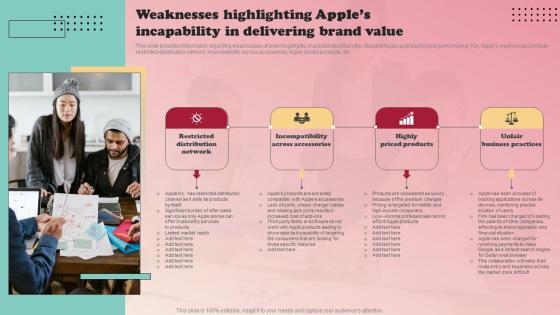 This slide provides information regarding weaknesses of brand highlights characteristics that offer disadvantages and lead to poor performance. Key Apples weaknesses include restricted distribution network, incompatibility across accessories, highly priced products, etc.Do you have to make sure that everyone on your team knows about any specific topic I yes, then you should give Product Branding Strategy Of Apple Weaknesses Highlighting Apples Microsoft Pdf a try. Our experts have put a lot of knowledge and effort into creating this impeccable Product Branding Strategy Of Apple Weaknesses Highlighting Apples Microsoft Pdf. You can use this template for your upcoming presentations, as the slides are perfect to represent even the tiniest detail. You can download these templates from the Slidegeeks website and these are easy to edit. So grab these today. This slide provides information regarding weaknesses of brand highlights characteristics that offer disadvantages and lead to poor performance. Key Apples weaknesses include restricted distribution network, incompatibility across accessories, highly priced products, etc.