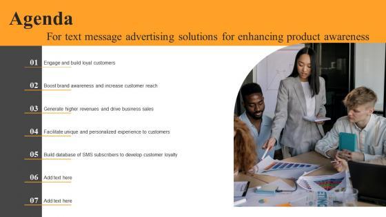 There are so many reasons you need a Agenda For Text Message Advertising Solutions For Enhancing Product Awareness Introduction Pdf. The first reason is you can not spend time making everything from scratch, Thus, Slidegeeks has made presentation templates for you too. You can easily download these templates from our website easily. Our Agenda For Text Message Advertising Solutions For Enhancing Product Awareness Introduction Pdf are topically designed to provide an attractive backdrop to any subject. Use them to look like a presentation pro.
