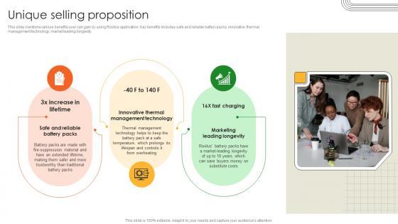 This slide mentions various benefits user can gain by using Rovilus application. Key benefits includes safe and reliable battery packs, innovative thermal management technology, market leading longevity. Welcome to our selection of the Unique Selling Proposition Battery Production Firm Investor Funding Elevator Pitch Deck These are designed to help you showcase your creativity and bring your sphere to life. Planning and Innovation are essential for any business that is just starting out. This collection contains the designs that you need for your everyday presentations. All of our PowerPoints are 100Percent editable, so you can customize them to suit your needs. This multi-purpose template can be used in various situations. Grab these presentation templates today. This slide mentions various benefits user can gain by using Rovilus application. Key benefits includes safe and reliable battery packs, innovative thermal management technology, market leading longevity.