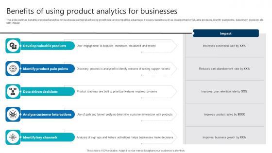 This slide outlines benefits of product analytics for businesses aimed at achieving growth rate and competitive advantage. It covers benefits such as development of valuable products, identify pain points, data driven decision, etc with impact Slidegeeks is one of the best resources for PowerPoint templates. You can download easily and regulate Benefits Of Using Product Analytics For Businesses Product Analytics Implementation Data Analytics V for your personal presentations from our wonderful collection. A few clicks is all it takes to discover and get the most relevant and appropriate templates. Use our Templates to add a unique zing and appeal to your presentation and meetings. All the slides are easy to edit and you can use them even for advertisement purposes. This slide outlines benefits of product analytics for businesses aimed at achieving growth rate and competitive advantage. It covers benefits such as development of valuable products, identify pain points, data driven decision, etc with impact