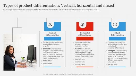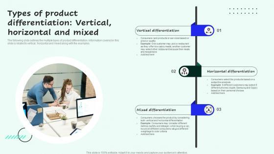 The following slide outlines the multiple types of product differentiation. Information covered in this slide is related to vertical, horizontal and mixed along with the examples. Are you searching for a Formulating Robust Branding Strategies To Effectively Combat Types Of Product Differentiation Vertical Horizontal Portrait PDF that is uncluttered, straightforward, and original Its easy to edit, and you can change the colors to suit your personal or business branding. For a presentation that expresses how much effort you have put in, this template is ideal. With all of its features, including tables, diagrams, statistics, and lists, its perfect for a business plan presentation. Make your ideas more appealing with these professional slides. Download Formulating Robust Branding Strategies To Effectively Combat Types Of Product Differentiation Vertical Horizontal Portrait PDF from Slidegeeks today.