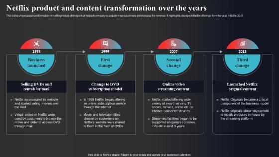 This slide showcases transformation in Netflix product offerings that helped company to acquire new customers and increase the revenue. It highlights change in Netflix offerings from the year 1998 to 2013 From laying roadmaps to briefing everything in detail, our templates are perfect for you. You can set the stage with your presentation slides. All you have to do is download these easy-to-edit and customizable templates. Netflix Product And Content Transformation Over The Years Enhancing Online Visibility Diagrams Pdf will help you deliver an outstanding performance that everyone would remember and praise you for. Do download this presentation today. This slide showcases transformation in Netflix product offerings that helped company to acquire new customers and increase the revenue. It highlights change in Netflix offerings from the year 1998 to 2013