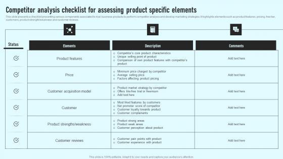 This slide presents a checklist presenting various components associated to rival business products to perform competitor analysis and develop marketing strategies. It highlights elements such as product features, pricing, free tier, customers, product strength weakness and customer reviews. If your project calls for a presentation, then Slidegeeks is your go-to partner because we have professionally designed, easy-to-edit templates that are perfect for any presentation. After downloading, you can easily edit Competitor Analysis Checklist For Assessing Product Specific Elements Comprehensive Guide Rules Pdf and make the changes accordingly. You can rearrange slides or fill them with different images. Check out all the handy templates This slide presents a checklist presenting various components associated to rival business products to perform competitor analysis and develop marketing strategies. It highlights elements such as product features, pricing, free tier, customers, product strength weakness and customer reviews.