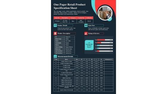Presenting you an exemplary One Pager Retail Product Specification Sheet PDF Document PPT Template. Our one-pager template comprises all the must-have essentials of an inclusive document. You can edit it with ease, as its layout is completely editable. With such freedom, you can tweak its design and other elements to your requirements. Download this One Pager Retail Product Specification Sheet PDF Document PPT Template Download now. Our One Pager Retail Product Specification Sheet PDF Document PPT Template are topically designed to provide an attractive backdrop to any subject. Use them to look like a presentation pro.