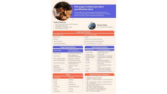 Presenting you a fantastic One Pager Technical Product Specification Sheet PDF Document PPT Template. This one-pager document is crafted on hours of research and professional design efforts to ensure you have the best resource. It is completely editable and its design allow you to rehash its elements to suit your needs. Get this One Pager Technical Product Specification Sheet PDF Document PPT Template Download now. Our One Pager Technical Product Specification Sheet PDF Document PPT Template are topically designed to provide an attractive backdrop to any subject. Use them to look like a presentation pro.