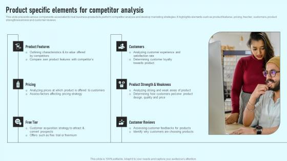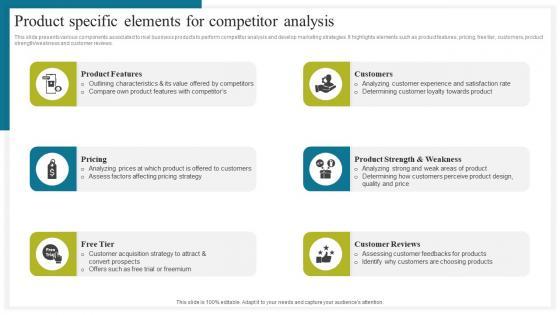 This slide presents various components associated to rival business products to perform competitor analysis and develop marketing strategies. It highlights elements such as product features, pricing, free tier, customers, product strength weakness and customer reviews. Slidegeeks is here to make your presentations a breeze with Product Specific Elements For Competitor Analysis Comprehensive Guide Portrait Pdf With our easy-to-use and customizable templates, you can focus on delivering your ideas rather than worrying about formatting. With a variety of designs to choose from, you are sure to find one that suits your needs. And with animations and unique photos, illustrations, and fonts, you can make your presentation pop. So whether you are giving a sales pitch or presenting to the board, make sure to check out Slidegeeks first. This slide presents various components associated to rival business products to perform competitor analysis and develop marketing strategies. It highlights elements such as product features, pricing, free tier, customers, product strength weakness and customer reviews.