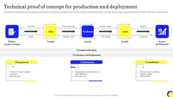 This slide provide information about technical proof of concept for production and deployment. It includes elements such as innovate, train, bootcamp, develop, deploy, support, scout, launch, network, learn, test, market, financing. Showcasing this set of slides titled Technical Proof Of Concept For Production And Deployment Ppt Layouts Influencers Pdf. The topics addressed in these templates are Support, Scout, Launch, Network. All the content presented in this PPT design is completely editable. Download it and make adjustments in color, background, font etc. as per your unique business setting. This slide provide information about technical proof of concept for production and deployment. It includes elements such as innovate, train, bootcamp, develop, deploy, support, scout, launch, network, learn, test, market, financing.
