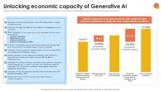 This slide provides information regarding the economic potential of generative AI systems in driving productivity with substantial impact on sectors such as banking, technology, life sciences, etc. Explore a selection of the finest Unlocking Economic Capacity Of Generative AI For Better Productivity AI SS V here. With a plethora of professionally designed and pre-made slide templates, you can quickly and easily find the right one for your upcoming presentation. You can use our Unlocking Economic Capacity Of Generative AI For Better Productivity AI SS V to effectively convey your message to a wider audience. Slidegeeks has done a lot of research before preparing these presentation templates. The content can be personalized and the slides are highly editable. Grab templates today from Slidegeeks. This slide provides information regarding the economic potential of generative AI systems in driving productivity with substantial impact on sectors such as banking, technology, life sciences, etc.