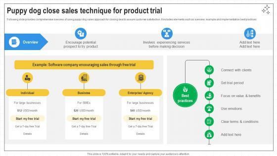 Following slide provides comprehensive overview of using puppy dog sales approach for closing deal to assure customer satisfaction. It includes elements such as overview, example and implementation best practices. Presenting this PowerPoint presentation, titled Closing Techniques To Seal Puppy Dog Close Sales Technique For Product Trial SA SS V, with topics curated by our researchers after extensive research. This editable presentation is available for immediate download and provides attractive features when used. Download now and captivate your audience. Presenting this Closing Techniques To Seal Puppy Dog Close Sales Technique For Product Trial SA SS V. Our researchers have carefully researched and created these slides with all aspects taken into consideration. This is a completely customizable Closing Techniques To Seal Puppy Dog Close Sales Technique For Product Trial SA SS V that is available for immediate downloading. Download now and make an impact on your audience. Highlight the attractive features available with our PPTs. Following slide provides comprehensive overview of using puppy dog sales approach for closing deal to assure customer satisfaction. It includes elements such as overview, example and implementation best practices.