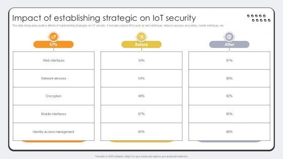 This slide showcases positive effects of implementing strategies on IoT security. It includes various KPIs such as web interfaces, network services, encryption, mobile interfaces, etc. Welcome to our selection of the Impact Of Establishing Strategic On Revolutionizing Production IoT Ppt Slide. These are designed to help you showcase your creativity and bring your sphere to life. Planning and Innovation are essential for any business that is just starting out. This collection contains the designs that you need for your everyday presentations. All of our PowerPoints are 100Percent editable, so you can customize them to suit your needs. This multi-purpose template can be used in various situations. Grab these presentation templates today. This slide showcases positive effects of implementing strategies on IoT security. It includes various KPIs such as web interfaces, network services, encryption, mobile interfaces, etc.