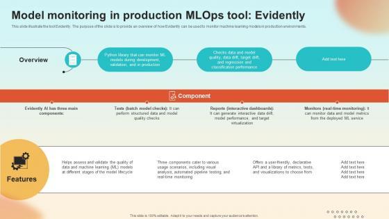 This slide illustrate the tool Evidently. The purpose of the slide is to provide an overview of how Evidently can be used to monitor machine learning models in production environments. Coming up with a presentation necessitates that the majority of the effort goes into the content and the message you intend to convey. The visuals of a PowerPoint presentation can only be effective if it supplements and supports the story that is being told. Keeping this in mind our experts created Model Monitoring In Production MLOps Exploring Machine Learning Operations Professional Pdf to reduce the time that goes into designing the presentation. This way, you can concentrate on the message while our designers take care of providing you with the right template for the situation. This slide illustrate the tool Evidently. The purpose of the slide is to provide an overview of how Evidently can be used to monitor machine learning models in production environments.
