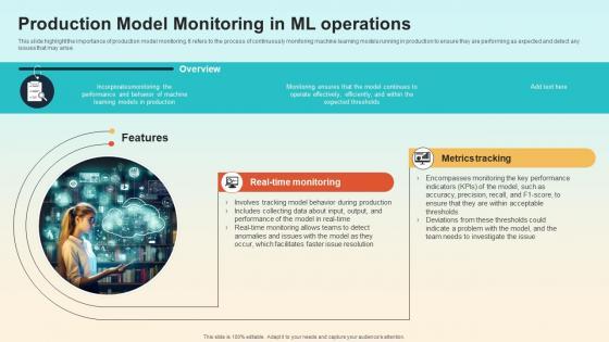 This slide highlight the importance of production model monitoring. It refers to the process of continuously monitoring machine learning models running in production to ensure they are performing as expected and detect any issues that may arise. Here you can discover an assortment of the finest PowerPoint and Google Slides templates. With these templates, you can create presentations for a variety of purposes while simultaneously providing your audience with an eye catching visual experience. Download Production Model Monitoring In ML Exploring Machine Learning Operations Inspiration Pdf to deliver an impeccable presentation. These templates will make your job of preparing presentations much quicker, yet still, maintain a high level of quality. Slidegeeks has experienced researchers who prepare these templates and write high quality content for you. Later on, you can personalize the content by editing the Production Model Monitoring In ML Exploring Machine Learning Operations Inspiration Pdf. This slide highlight the importance of production model monitoring. It refers to the process of continuously monitoring machine learning models running in production to ensure they are performing as expected and detect any issues that may arise.