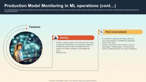 This slide highlight the importance of production model monitoring. It refers to the process of continuously monitoring machine learning models running in production to ensure they are performing as expected and detect any issues that may arise. Whether you have daily or monthly meetings, a brilliant presentation is necessary. Production Model Monitoring In ML Operations Introduction To MLOPs IT can be your best option for delivering a presentation. Represent everything in detail using Production Model Monitoring In ML Operations Introduction To MLOPs IT and make yourself stand out in meetings. The template is versatile and follows a structure that will cater to your requirements. All the templates prepared by Slidegeeks are easy to download and edit. Our research experts have taken care of the corporate themes as well. So, give it a try and see the results. This slide highlight the importance of production model monitoring. It refers to the process of continuously monitoring machine learning models running in production to ensure they are performing as expected and detect any issues that may arise.